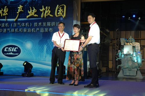 中國船級社廣州分社張宇總工程師親自向廣州柴油機廠股份有限公司李偉彪總經(jīng)理頒發(fā)M23G氣體機型式試驗認可證書。
