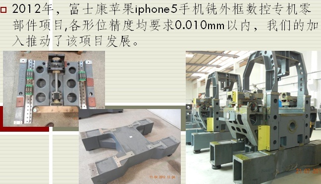 在項目生產加工過程中面對毛坯短缺、人手不足、設備老化損壞等實際困難,黨員骨干積極發揮黨員先進性,勇于擔當、甘于奉獻,通過優化工作(工藝)流程、靈活制定生產計劃、創新開展項目攻關,大大提高了車間工作效率和產品質量,能夠穩定保持每米0.01mm形位精度(超過國家機床標準)的高質量水平,解決了許多國內機加工制造難題,高標準完成了任務,為公司贏得了卓越機加工口碑,以及客戶的青睞和信任,與客戶建立了良好的合作關系。近幾年,先后為6家制造機床的廠家開發關鍵零部件,其中為富士康制造蘋果IPhone5.0鉆銑鈦合金邊框數控專機零部件就達200多臺套。